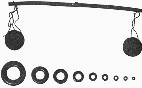 春秋時期,楚國制造有小型衡器——木衡、銅環權,用來稱黃金貨幣。完整的一套環權共十枚,分別為一銖、二銖、三銖、六銖、十二銖、一兩、二兩、四兩、八兩、一斤。一銖重0.69克,一兩重15.5克,一斤251.3克,十枚相加約500克,為楚制二斤。中國歷史博物館藏有一支戰國時銅衡桿,正中間有提紐和穿線孔,一面顯出貫通上下的十等分刻線。