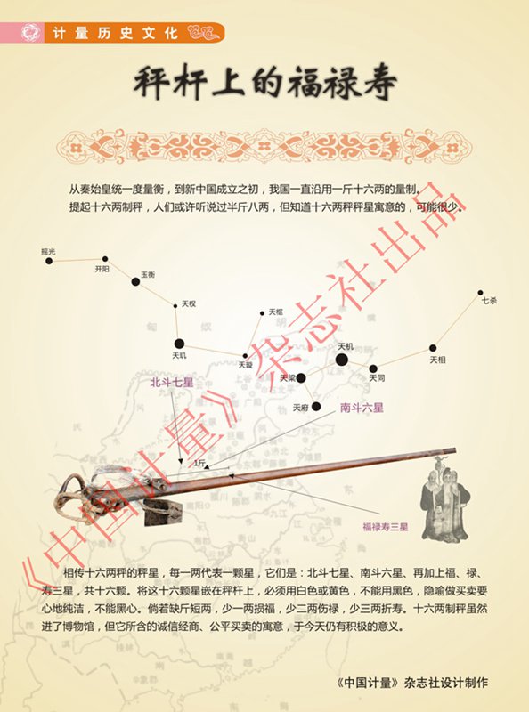 那時十六兩秤叫十六金星秤,是由北斗七星、南斗六星加福祿壽三星組成十六兩的秤星,告誡做買賣的人要誠實信用,不欺不瞞,否則,短一兩無福,少二兩少祿,缺三兩折壽。